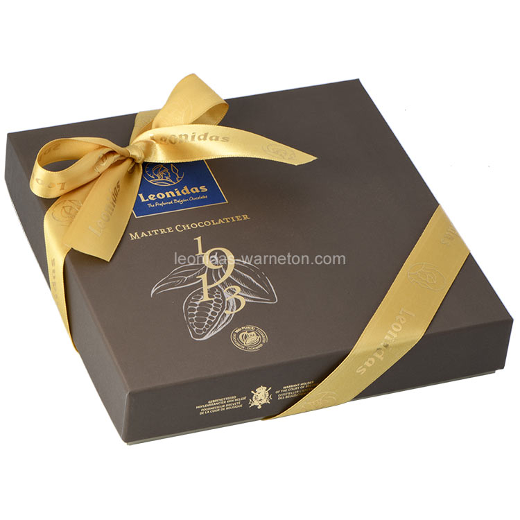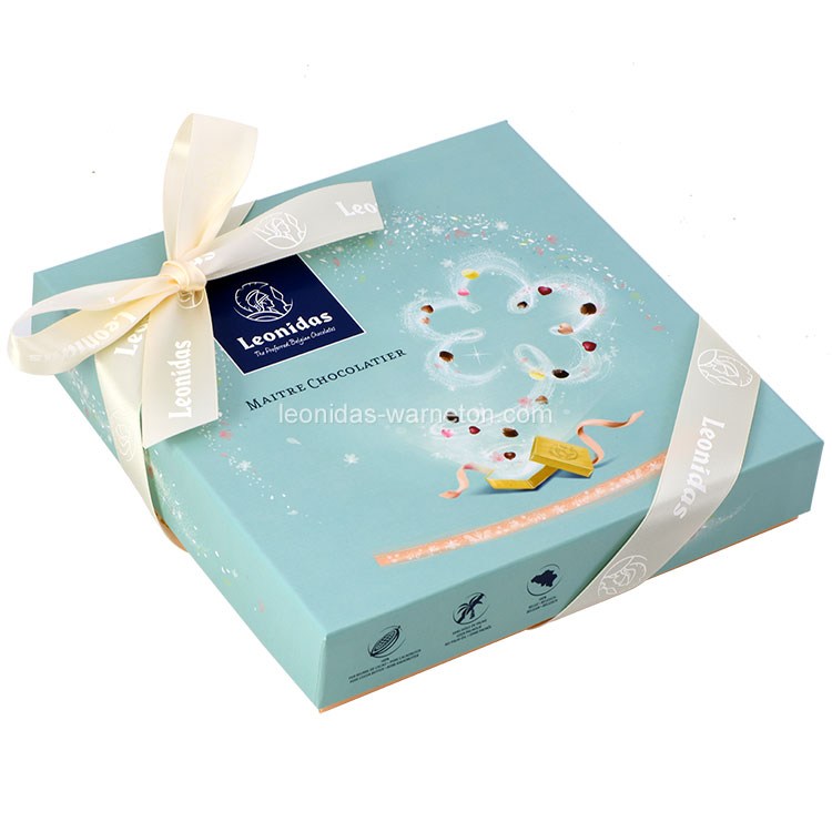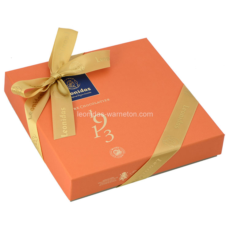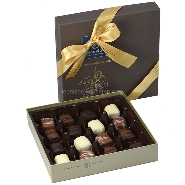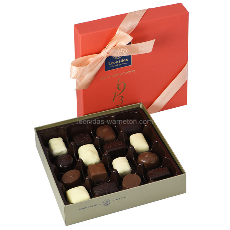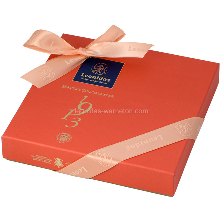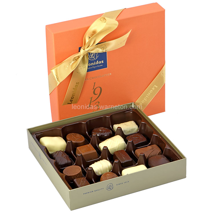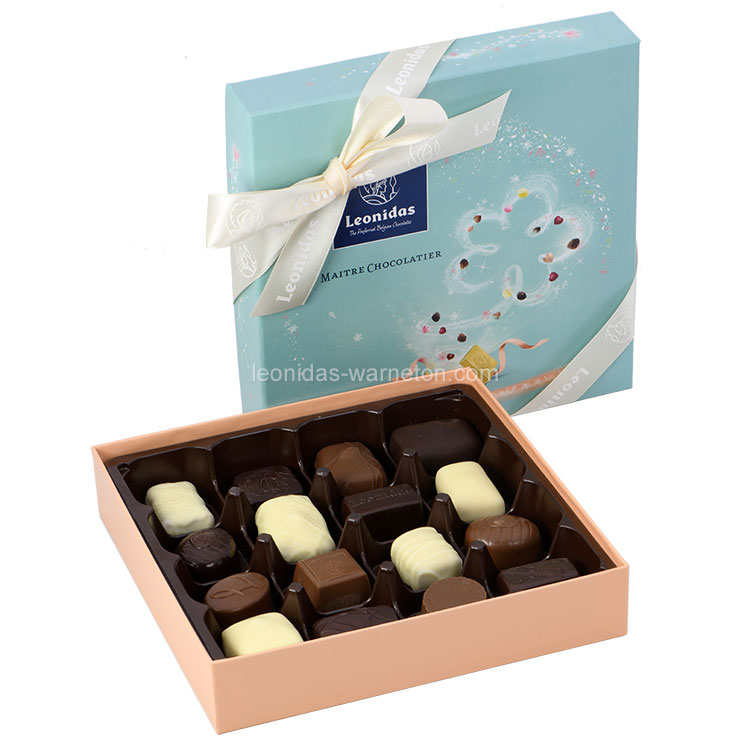 Nos coffrets Santiago Leonidas sont dorénavant disponibles en quatre couleurs : marron, orange, bleu ciel et rouge-orangé garnis de 16 chocolats Leonidas assortis (au choix).